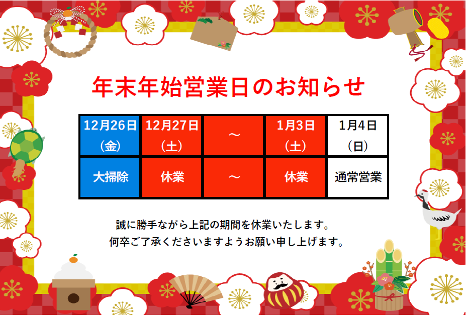誠に勝手ながら12月27日(金)~1月3日(金)は冬季休業とさせていただきます。